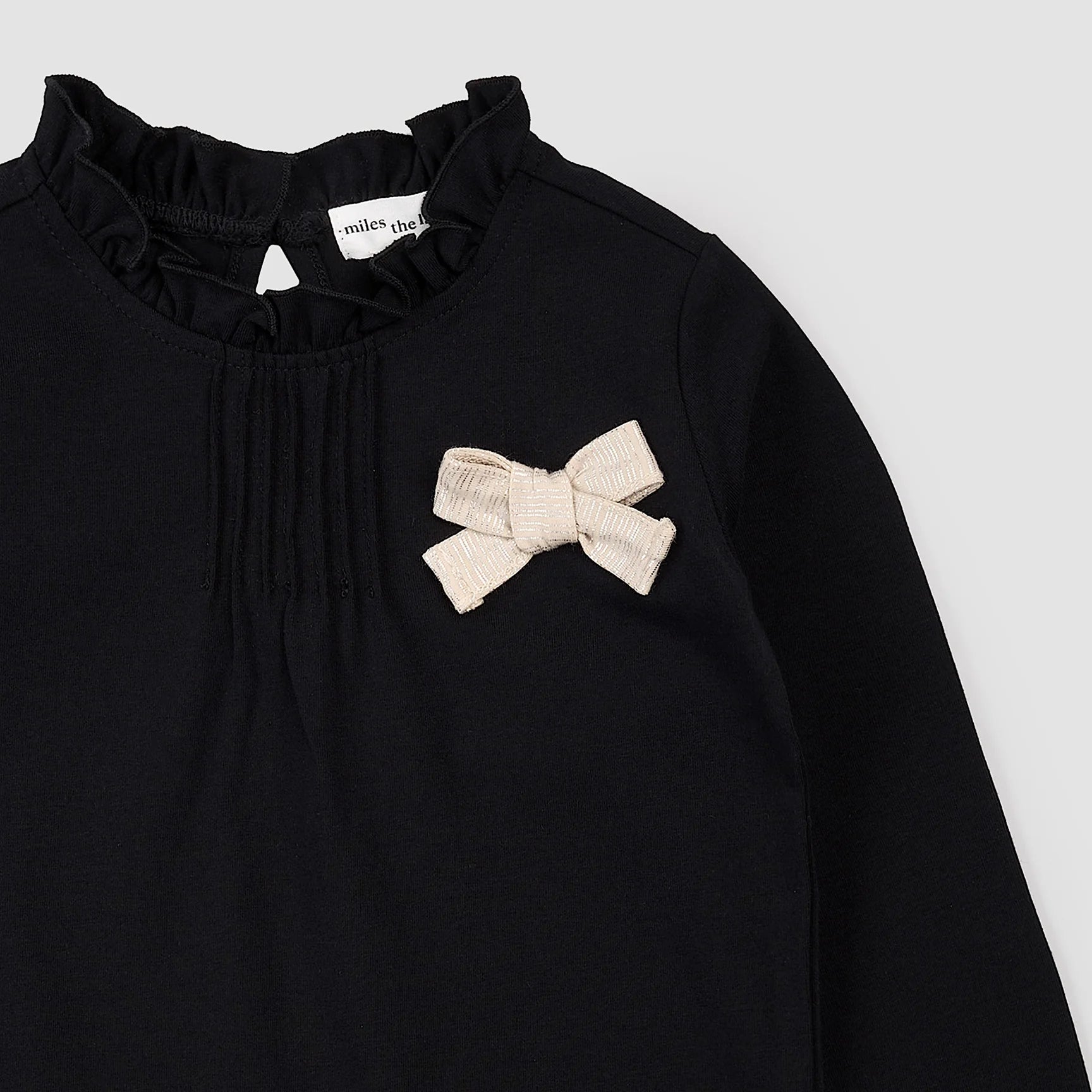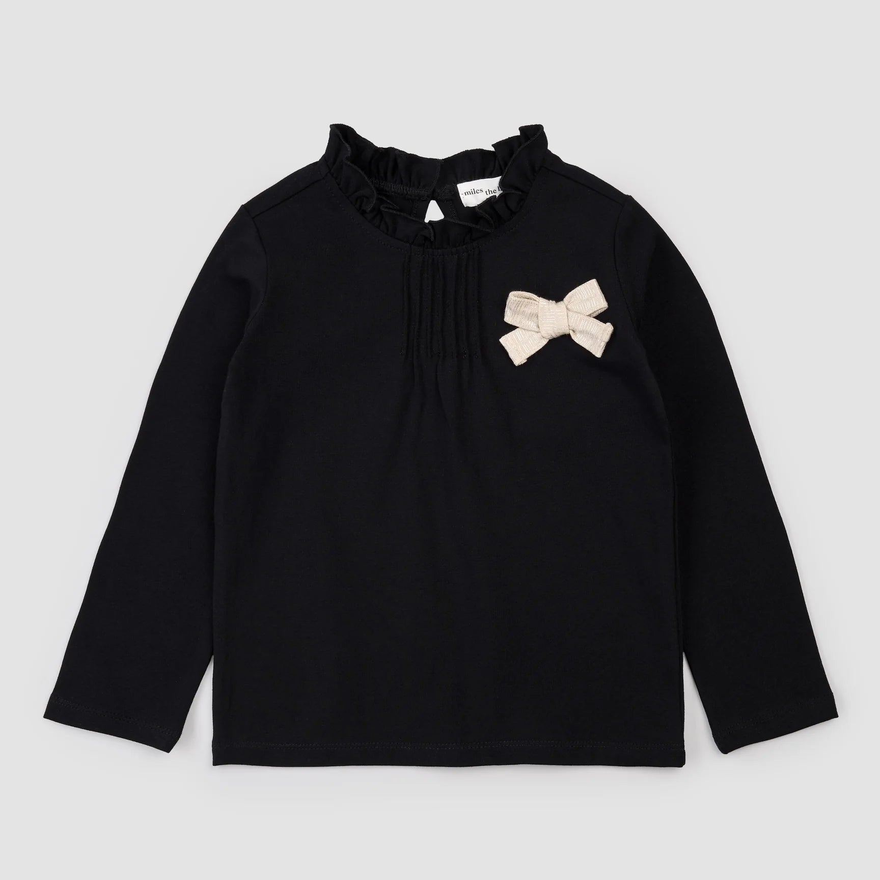 A refined wardrobe staple that adds a little elegance into their everyday outfits, this black top features a ruffled neckline and a grosgrain bow on the front. Made from organically grown cotton jersey, the top is light and flexible, allowing her to live her day to the fullest while still looking sophisticated.