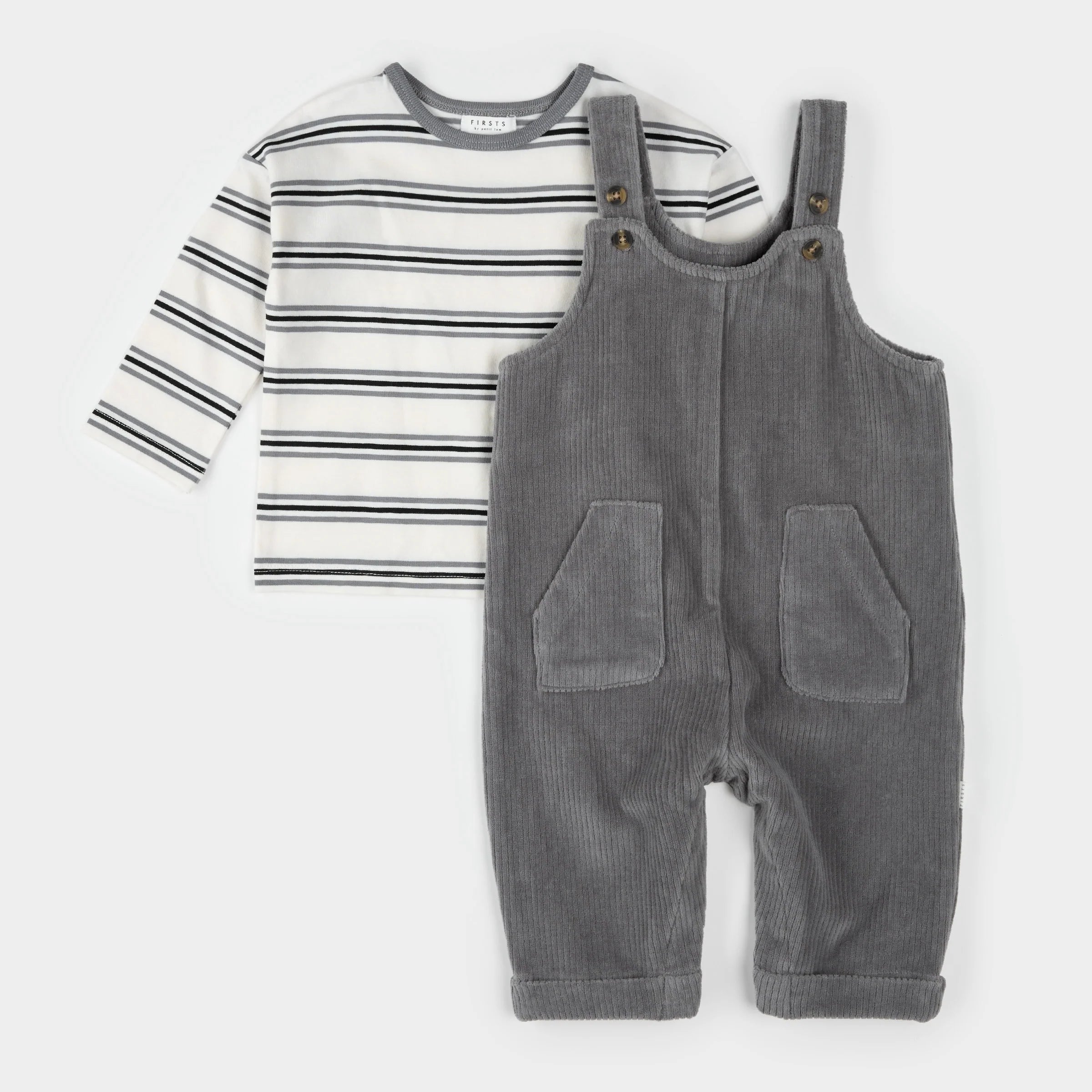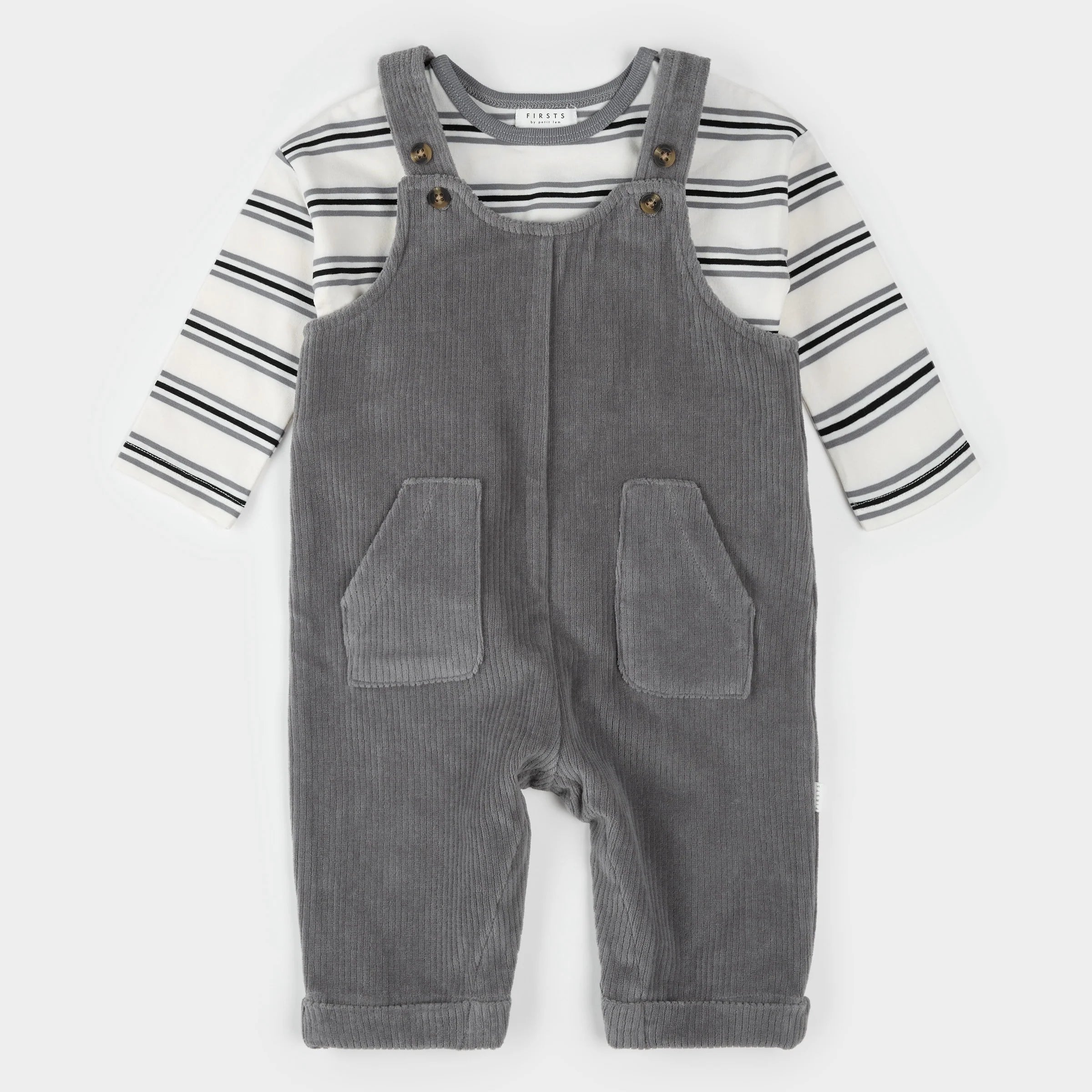 This timeless outfit set features a long-sleeved, striped top and coordinating corduroy overalls. Perfect for the colder months, the set keeps your little guy looking effortlessly cute and cozy when heading out with mom or dad. With two button options on the straps, the set has a little extra longevity when he starts to grow.