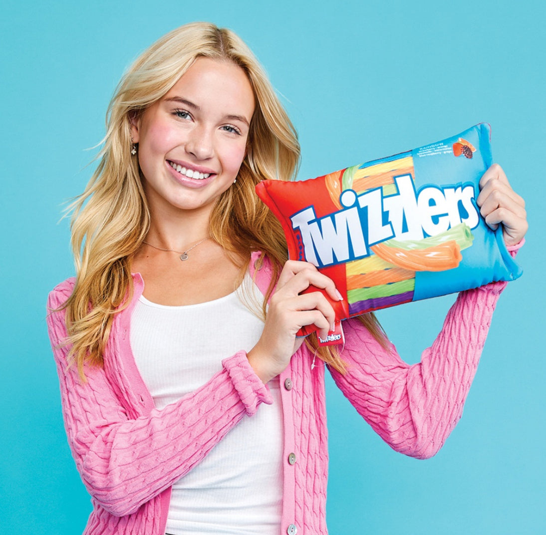 - This full-color, officially licensed pillow is comprised of a fleece zipper closure bag with a clear window in the front to show the six plushie Twizzler shaped pillows inside!