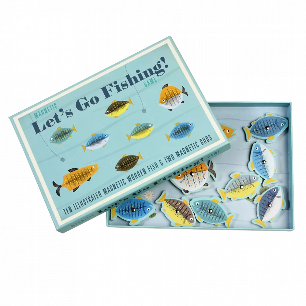 Magnetic Let's Go Fishing Game- ten illustrated magnetic wooden fish and two magnetic fishing rods. Cast your line and catch a fish. This beautifully illustrated magnetic fishing game is a great way for little ones to improve their motor skills, learn to recognize their numbers and count from one to ten. Contents: