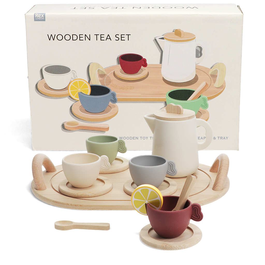 - Product materials: Tray, saucers, spoons, lemon slice & teapot lid: Wood; Teacups & teapot: Silicone