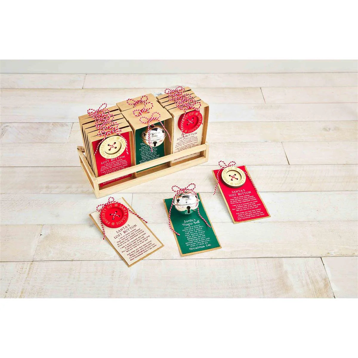 Laser engraved wooden button or metal bell ornament. Comes on corrugate card with canvas sentiment patch.